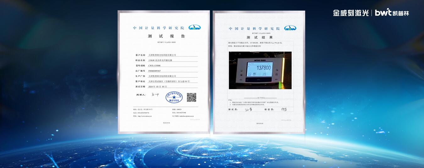 現場還發布了中國計量科學研究院的權威測試報告。經過對產品整機的專業檢測,中國計量科學研究院對設備輸出功率的鑒定結論為:功率≥135kW(滿功率直接測試),權威認證為工業超厚板材高效加工帶來更多信心。